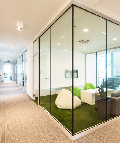 Soczystą zieleń, grafit i stalowe szarości znajdziemy nie tylko na elewacjach. Wnętrza stanowią spójną kontynuację tego, co zaprojektowaliśmy na zewnątrz. Kolorystykę poszerzyliśmy o biel, która stanowi doskonałe uzupełnienie dla palety barw Sun Garden. Grafitowe podłogi i donice, szarość ślusarki czy świeża zieleń tapicerki tworzą eleganckie wnętrza biurowe.