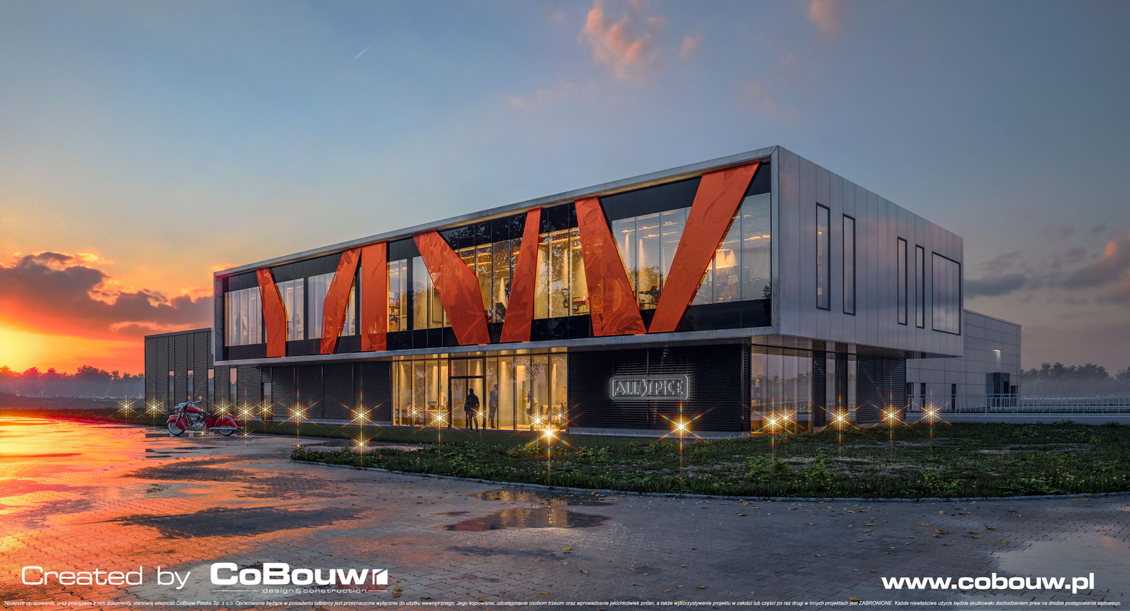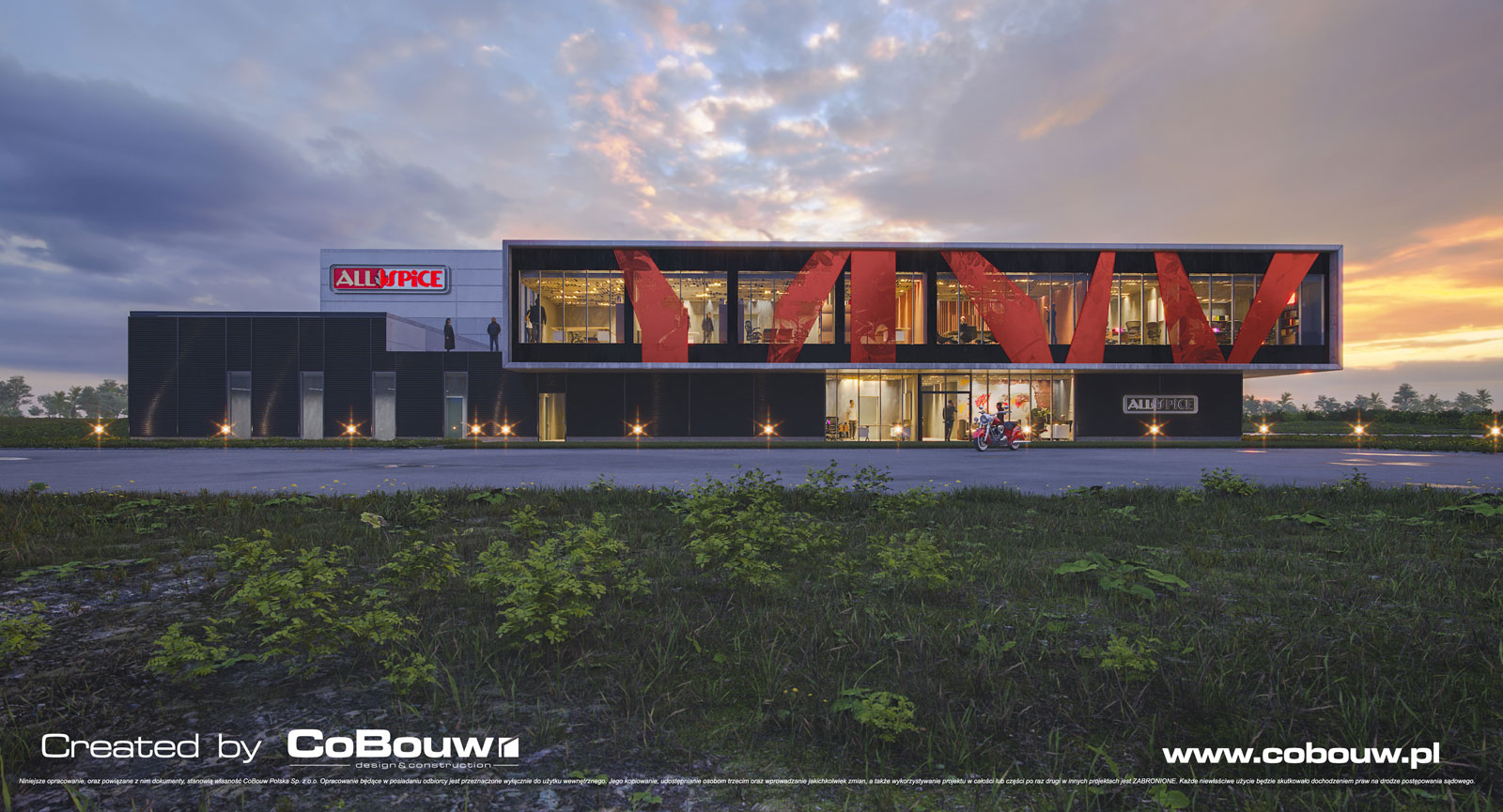 Nowoczesna, piętrowa bryła budynku z dużymi przeszkleniami i lekkimi podcieniami tworzy dynamiczny, otwarty charakter. Fasada łączy szkło i metal w eleganckiej czerni i srebrze, przełamanej intensywnymi czerwono-pomarańczowymi akcentami. Pionowe wstawki w kształcie litery „V” nawiązują do ostrości przypraw i energii – spójnie oddając charakter marki AllSpice. Całość dopełnia subtelne oświetlenie podkreślające wejście do budynku, które po zmroku tworzy efekt prestiżu i nowoczesności.