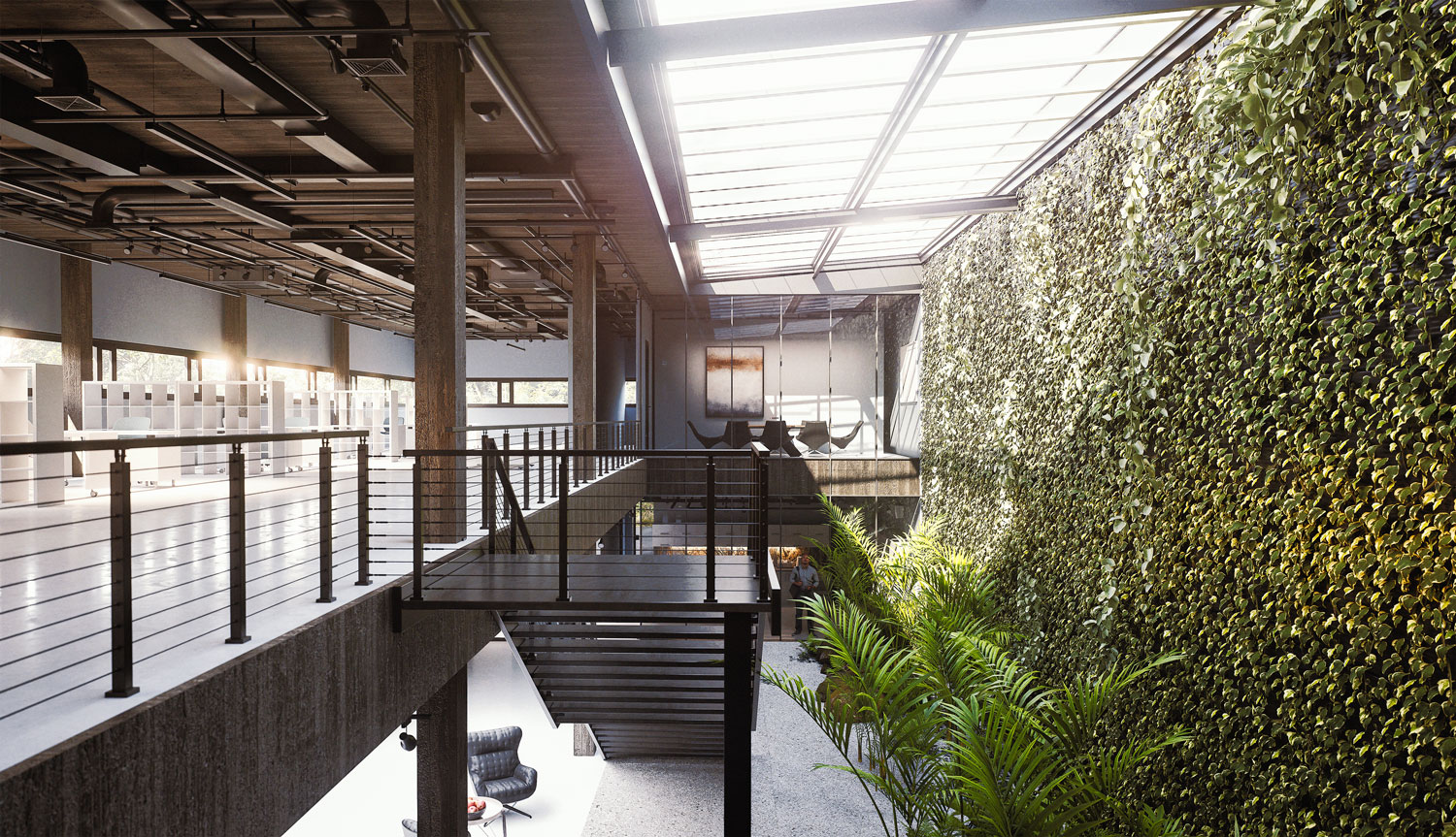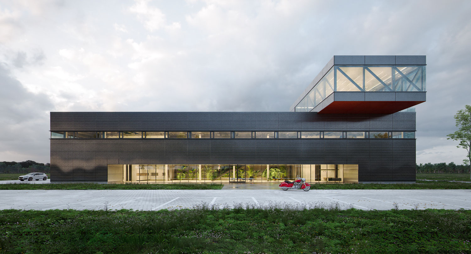 Całość projektu została zaplanowana jako synergia funkcjonalności i designu. Proste linie, monolityczne powierzchnie, przemyślane detale oraz elementy zieleni tworzą harmonijne połączenie nowoczesnej architektury przemysłowej z elegancką, reprezentacyjną formą.