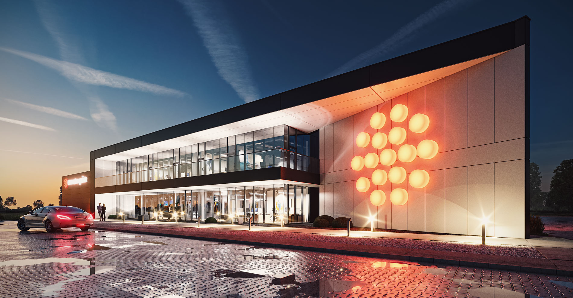 Kompleks produkcyjno-biurowy zaprojektowaliśmy kierując się reprezentacyjnym charakterem obiektu. Proste linie i klarowna kompozycja nadają całości elegancji, jednocześnie wyraźnie akcentując kluczowe elementy architektoniczne.