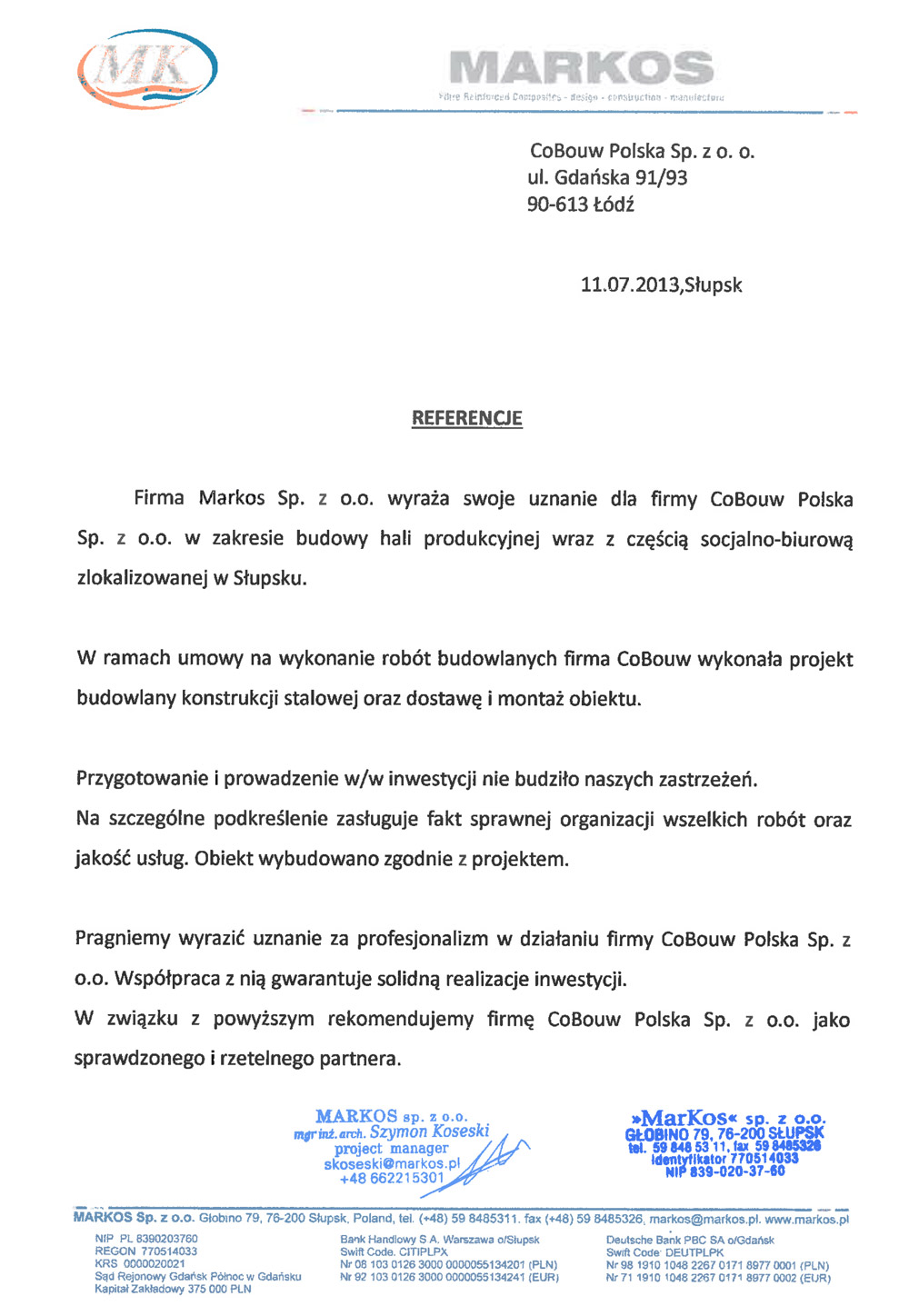 Obiekt przemysłowy dla Markos jest 22 inwestycją, jaką zrealizujemy w Słupsku i okolicach. Co więcej obecnie jesteśmy w trakcie rozbudowy centrum logistycznego Indeka Logistic City. Nowa hala logistyczna powstaje w odległości zaledwie 3 km od hali Markos. Wśród zrealizowanych w pobliżu inwestycji możemy wymienić ponadto nasze hale dla firmy Auto-Hak, Indeka lub Viscon.