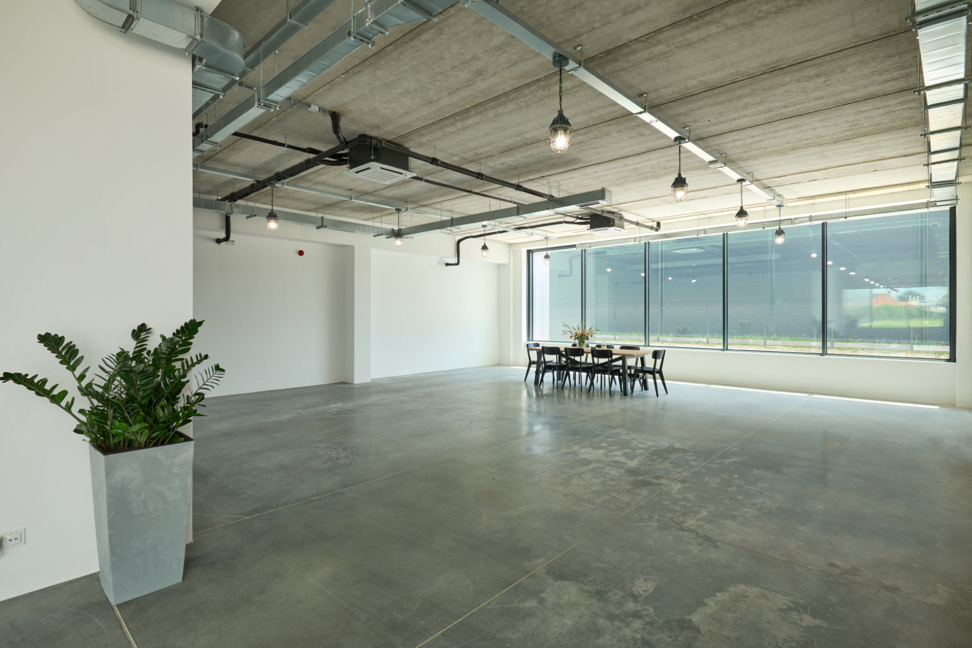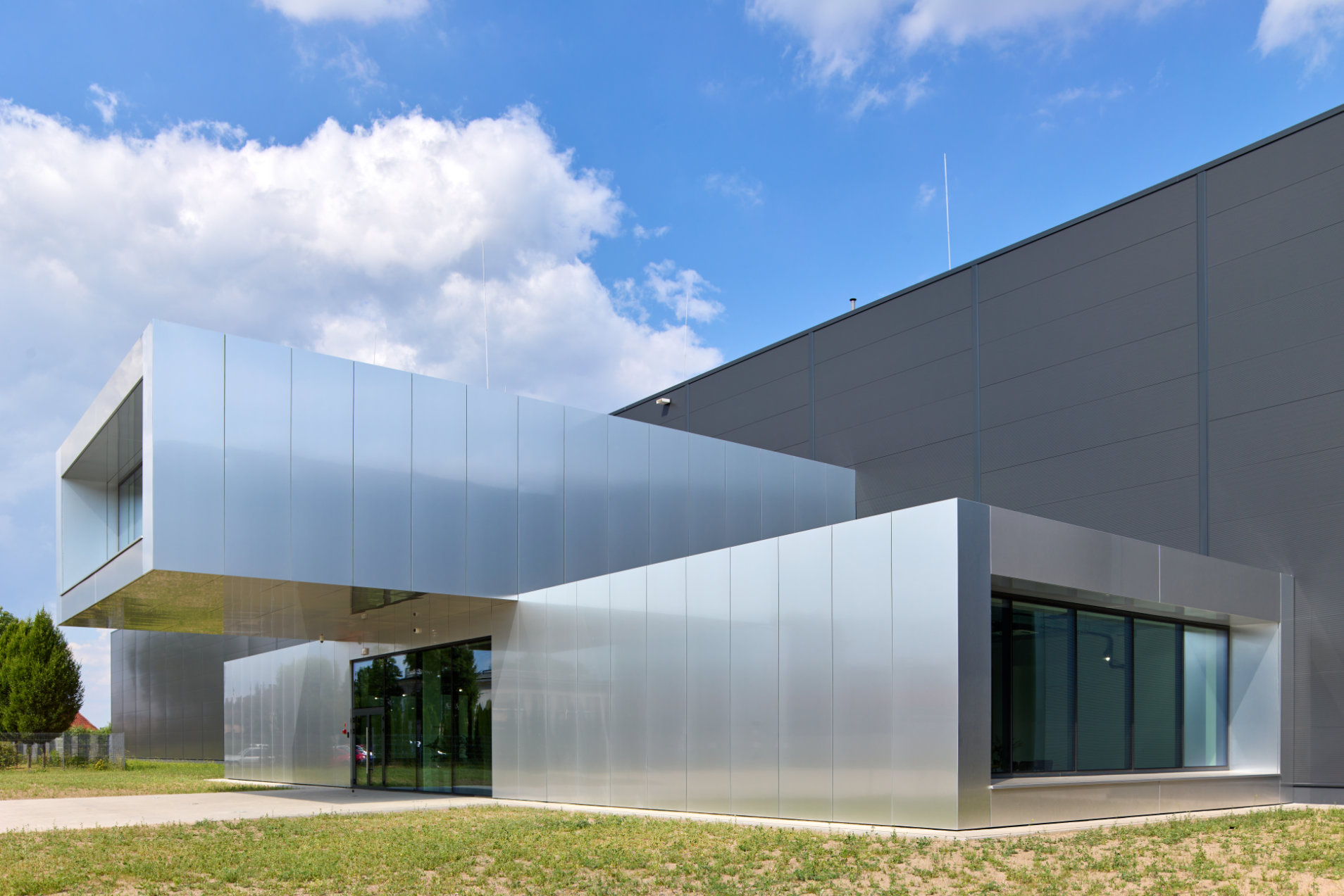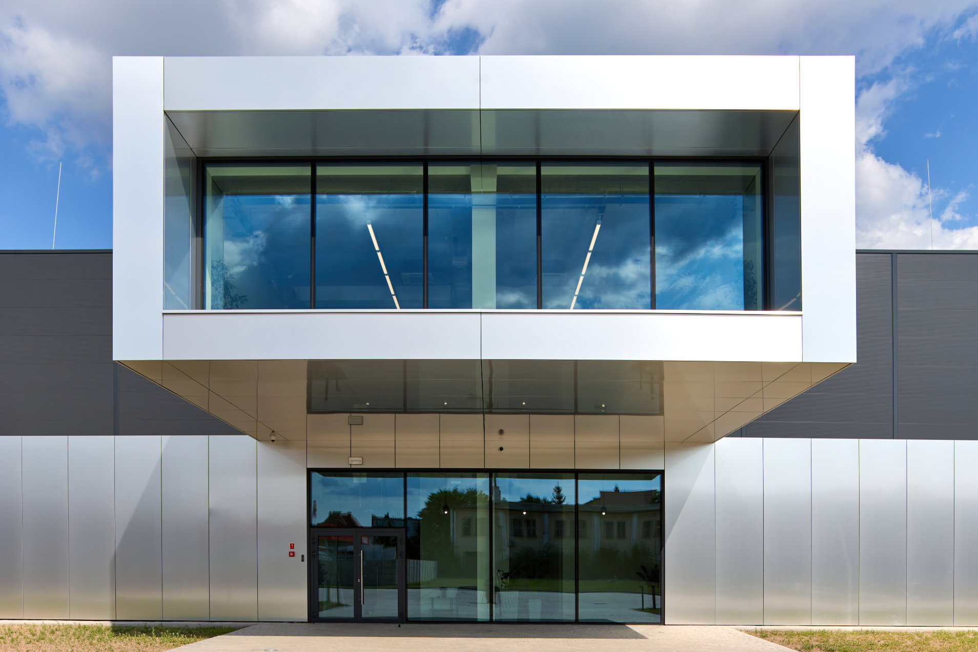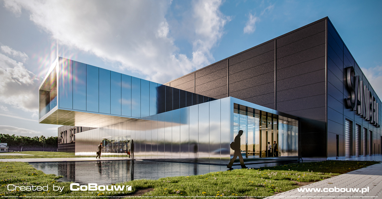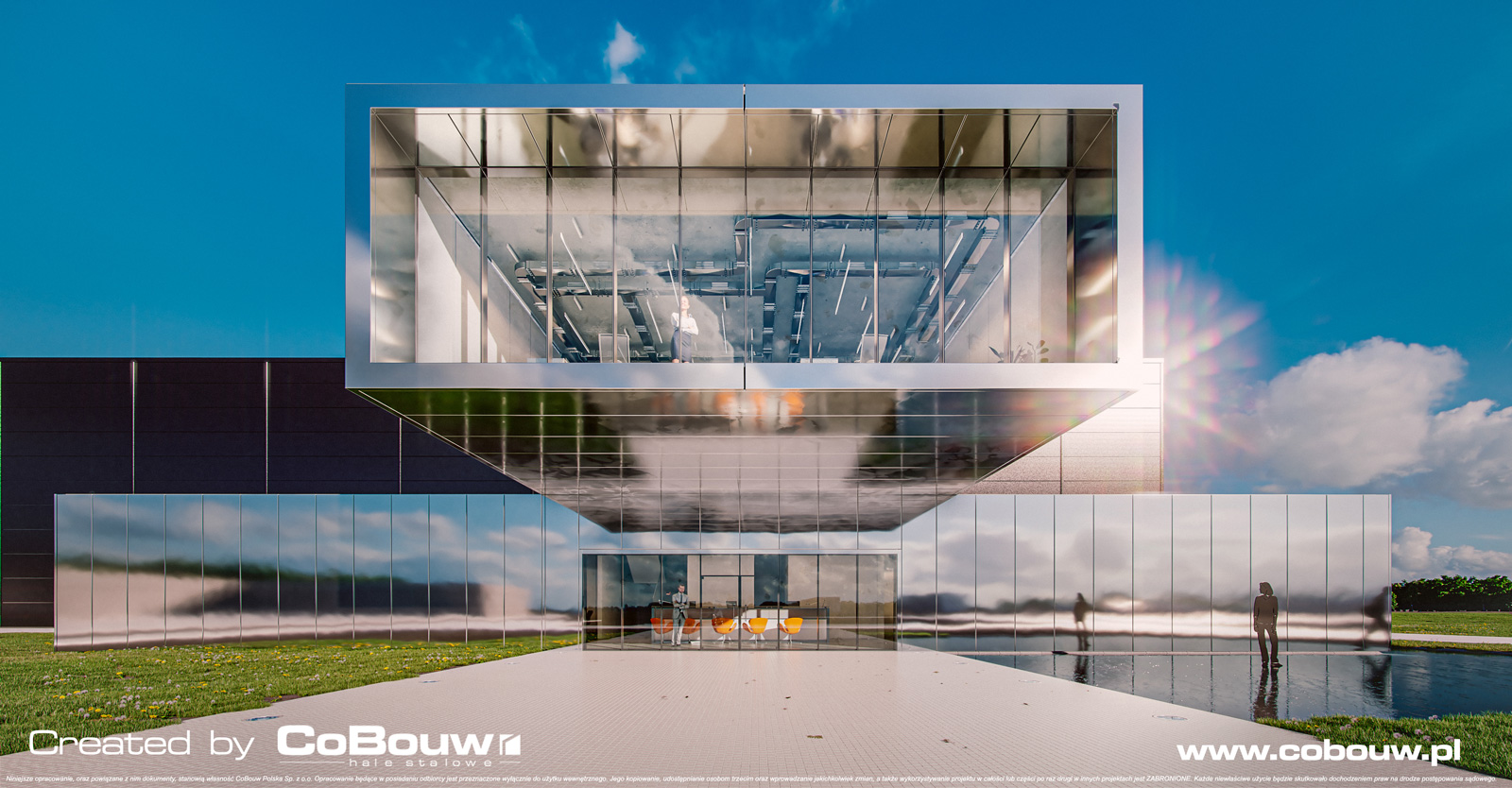 Design zdominuje zaprojektowana i proponowana przez nas część wystawienniczo-biurowa. Kolejny widoczny ale spójny akcent będzie stanowiło duże przestrzenne logo firmy umieszczone na elewacji hali.