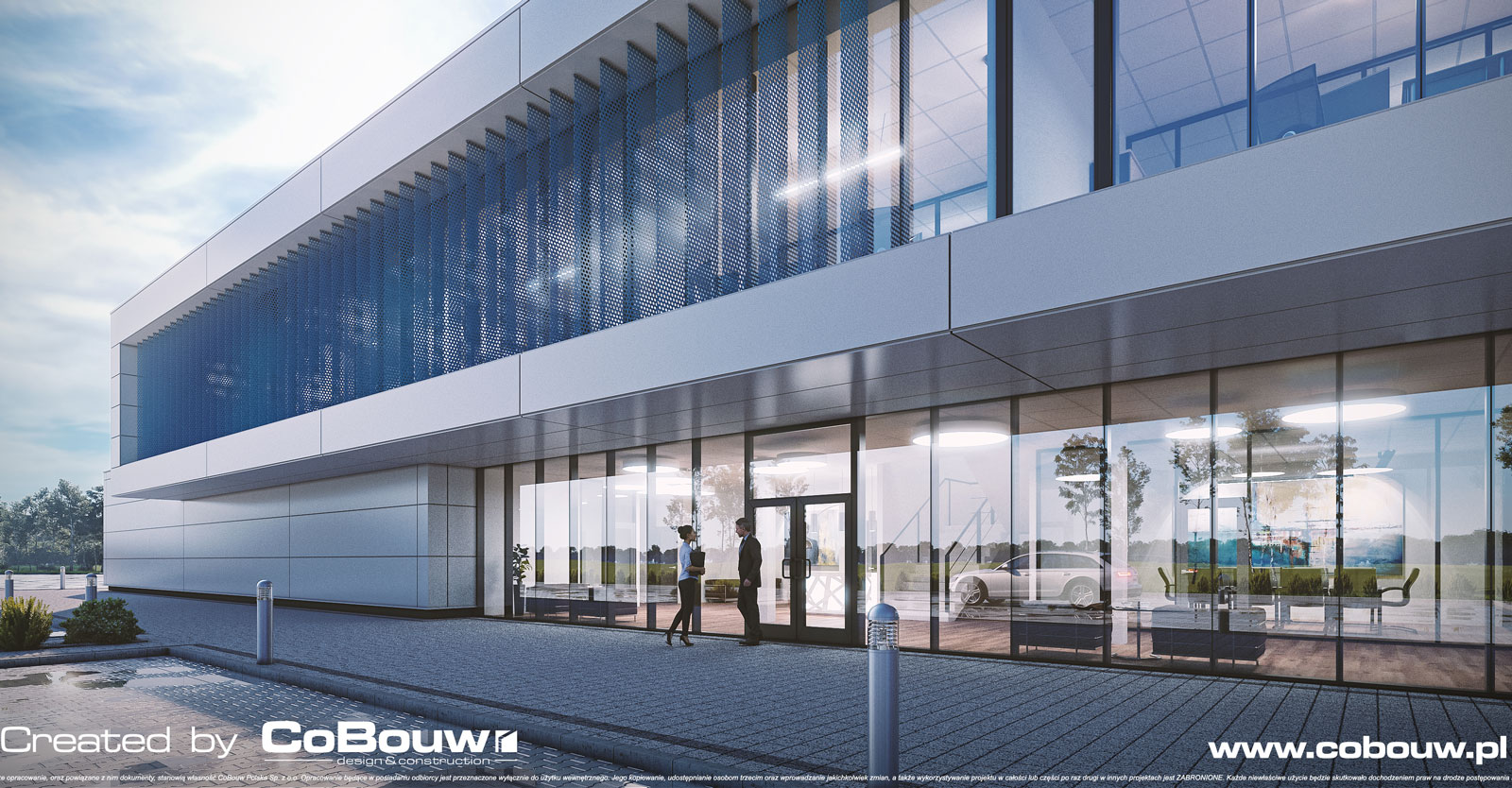Budynek biurowy o powierzchni ponad 1.000 m2 zostanie rozplanowany na 2 kondygnacjach. Podcień, elewacja w kontrastującym z halą kolorze oraz wielkopowierzchniowe przeszklenia nadadzą biurowcowi nowoczesnego i eleganckiego stylu.