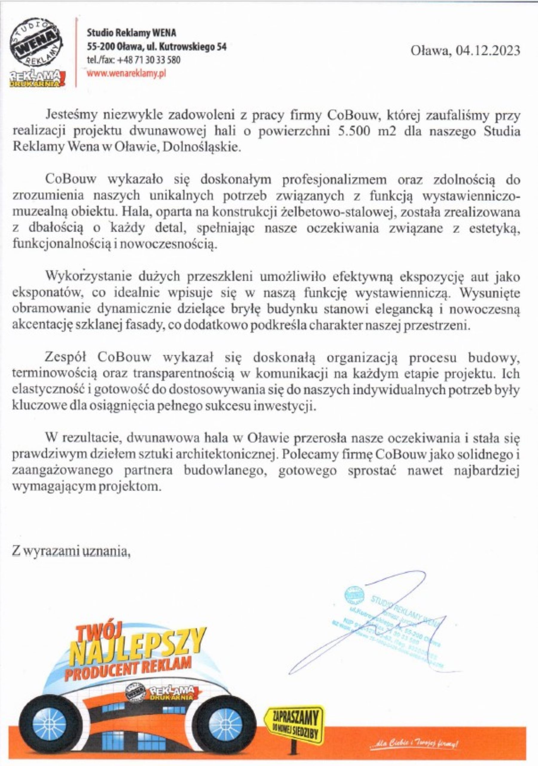Studio Reklamy Wena kreuje materiały reklamowe. Wydruki, gadżety, ekspozycje reklamowe lub projektowanie stron www to tylko niewielka część oferty firmy oraz jej możliwości. Hala, którą zaprojektujemy i wybudujemy dla Weny powstanie w wyniku pasji motoryzacyjnej właścicieli Studia. Będzie to pierwsza w naszym portfolio realizacja o funkcji muzealnej.