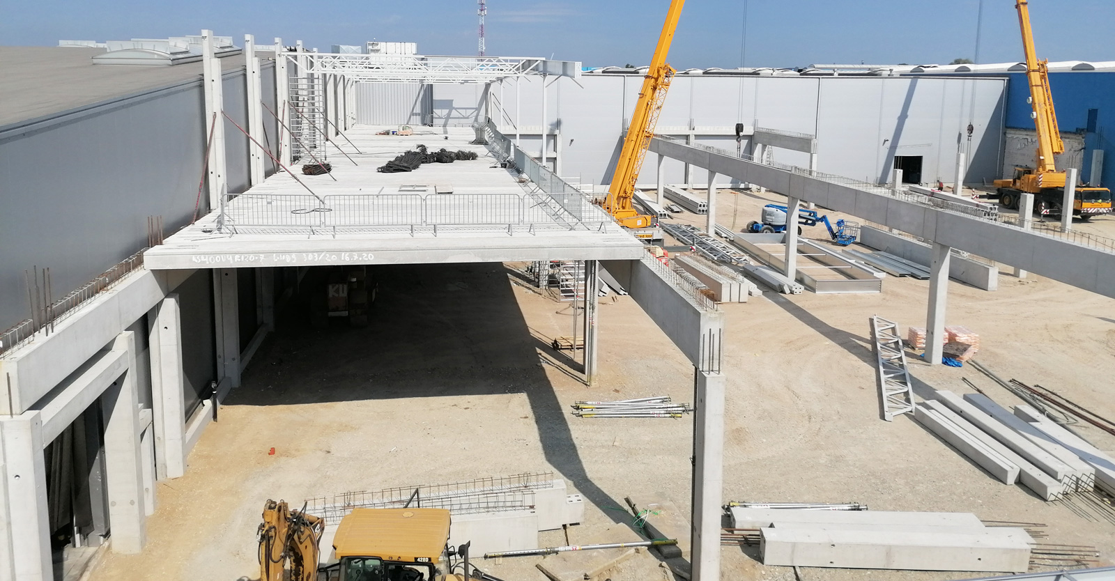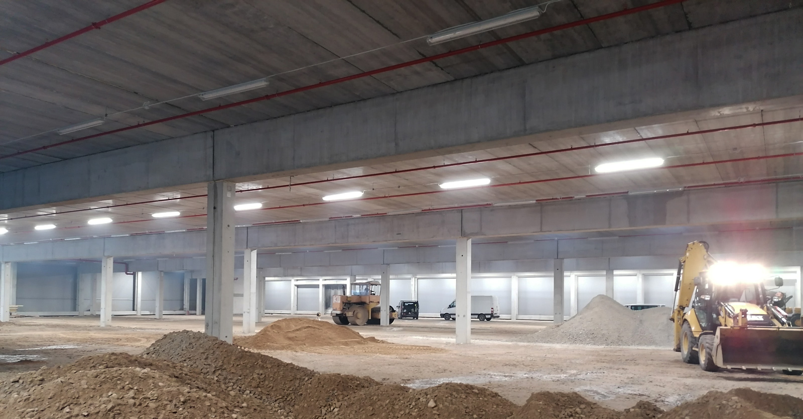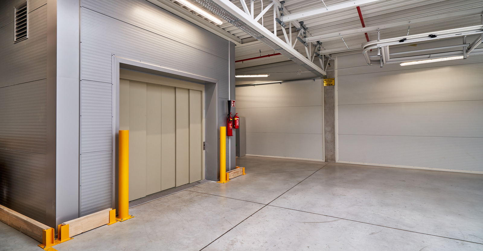 W hali na wysokości ponad 6 m wykonamy piętro z płyt kanałowych, przygotowanych pod obciążenie 800 kg/m2. Płyty zostaną ułożone na ryglach żelbetowych, opartych na wspornikach wychodzących ze słupów. W hali zostanie wykonany szyb windowy z dźwigiem towarowo-osobowym o udźwigu 2.600 kg oraz maszynownią.