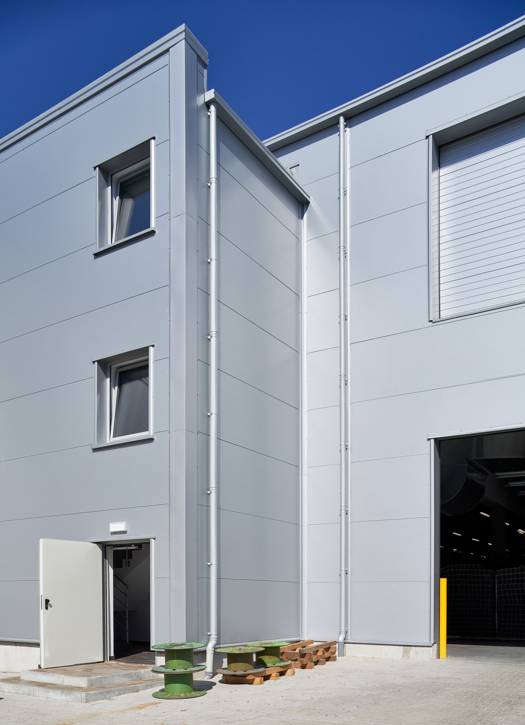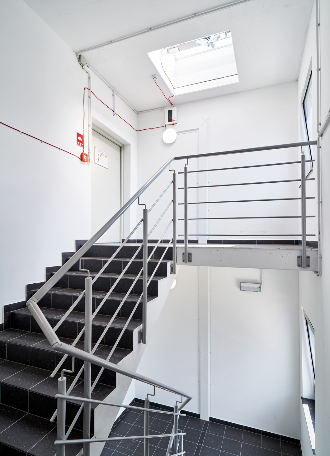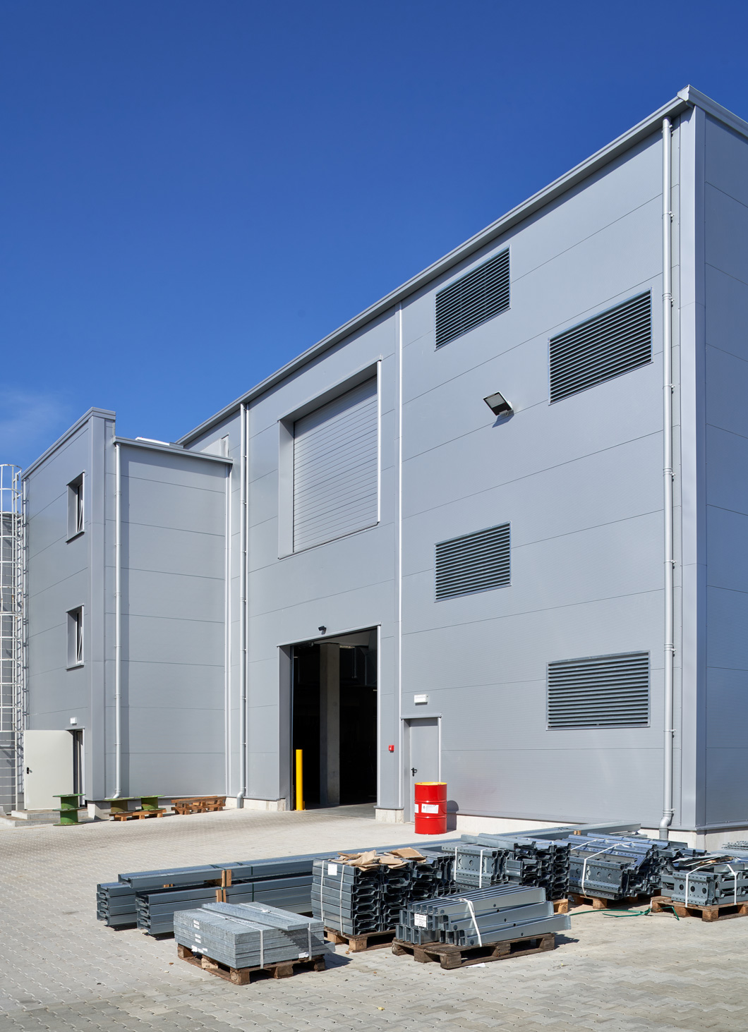W ramach inwestycji wykonamy zewnętrzną klatkę schodową w technologii murowanej – ściany zewnętrzne zostaną obłożone płytą w kolorze elewacji hali. Klatka schodowa zostanie wyposażona w dodatkowy spocznik dla połączenia z halą sąsiadującą.